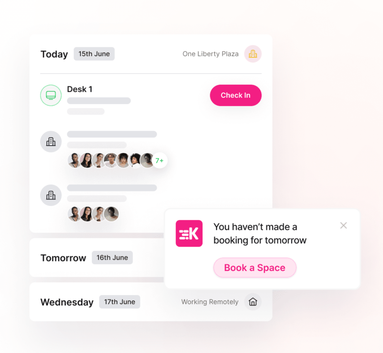 Homepage now includes Smart Suggestions to help you coordinate your time in the office, allowing you to know when your team and starred colleagues will be coming in.