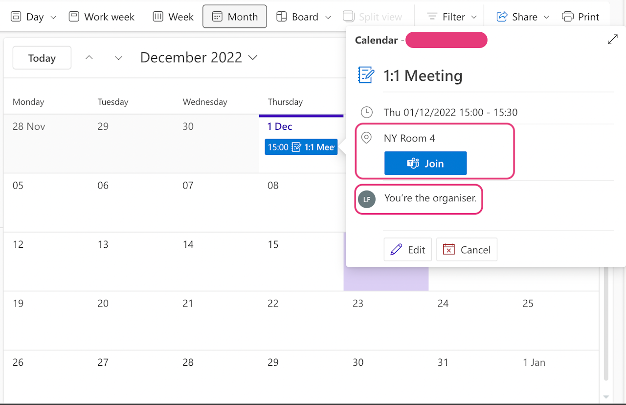 Bookings will not sync to Kadence if there is no event organizer, or if the room is not added as the location. You can check to see if your event has an organizer and/or a location by clicking on the event in your calendar. See images: